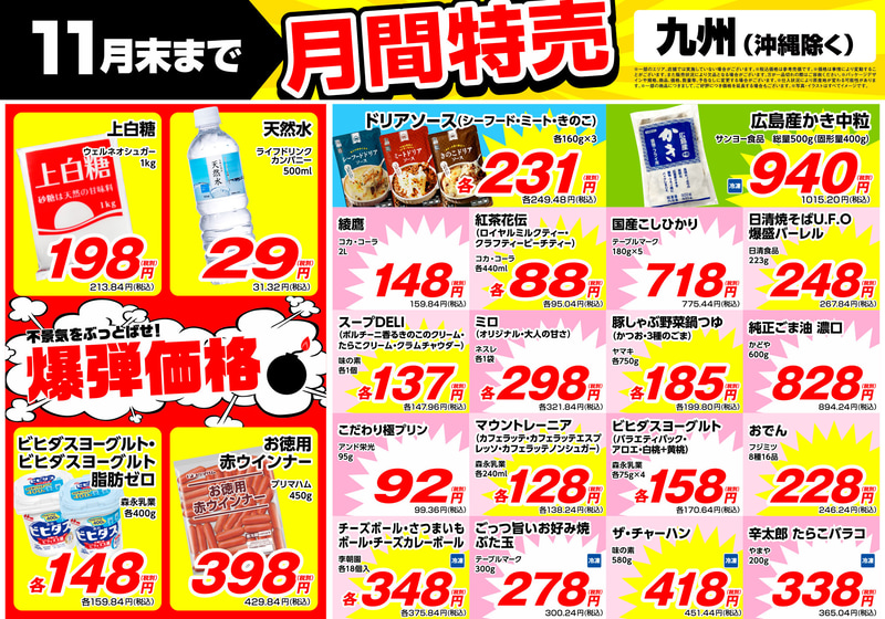 業務スーパーが11月の月間特売チラシ公開! 「プリマハム お徳用赤ウインナー 450g」税込429円、「天然水 500ml」税込31円、「国産こしひかり180g×5食」税込753円、「国産切り餅1kg」税込678円などの爆弾価格も