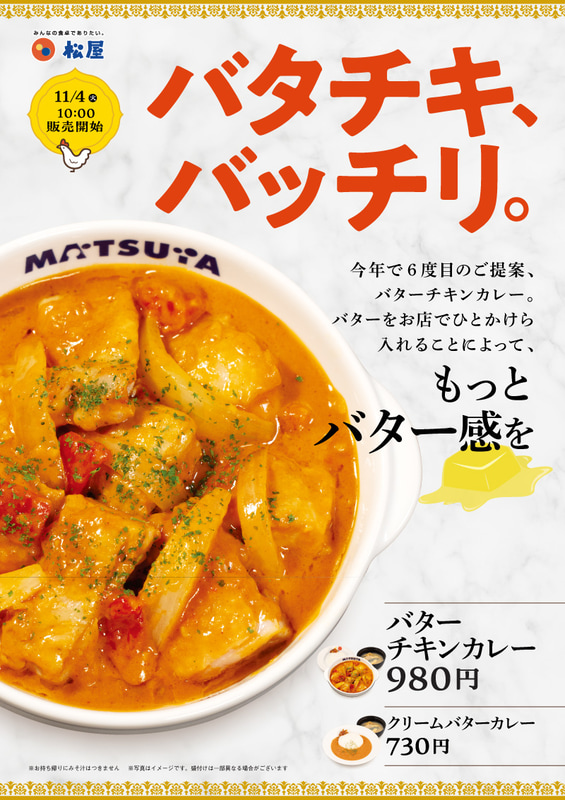 今年で6度目の提案の「バタチキ」はバターをひとかけら入れて“バタチキ、バッチリ。” 松屋が「バターチキンカレー」を本日4日(火)から69店舗でテスト販売