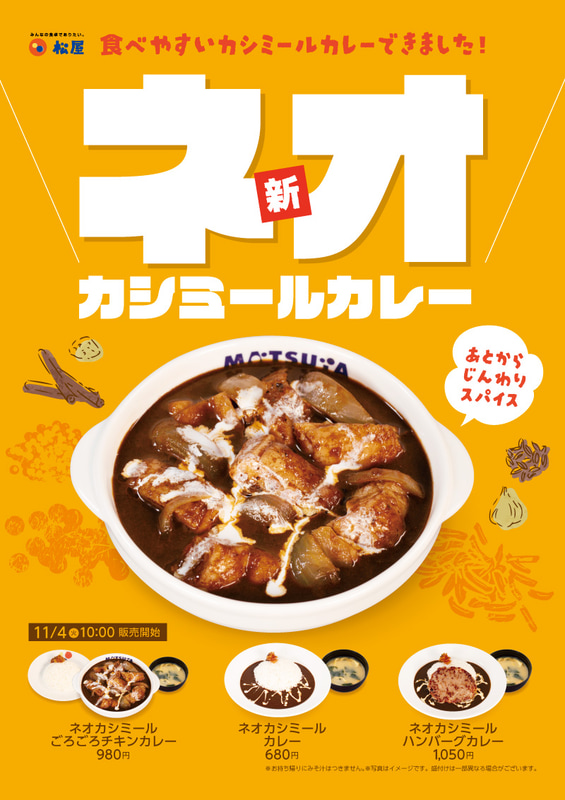 あとからじんわりスパイスで「食べやすいカシミールカレーできました!」 松屋が「ネオカシミールカレー」を税込680円で本日4日(火)から69店舗でテスト販売~ごろチキ、ハンバーグトッピングも