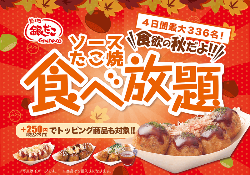 築地銀だこのたこ焼「食べ放題」が45分間税込1,089円! 「イオン超!ブラックフライデー」で今年も開催~本日10日(月)から店頭のみで予約開始、定員に達し次第終了! +税込275円でトッピング商品も食べ放題!