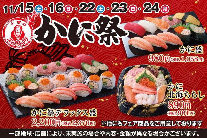 本ずわいがに3貫、かにたたき魚卵軍艦、まぐろなど計10貫の「かに盛」税込1,058円、「かに北海ちらし」税込961円! 小僧寿しが、本ずわいがに&紅ずわいがにを使った「小僧の太鼓判『かに祭』」を本日15日(土)から開催