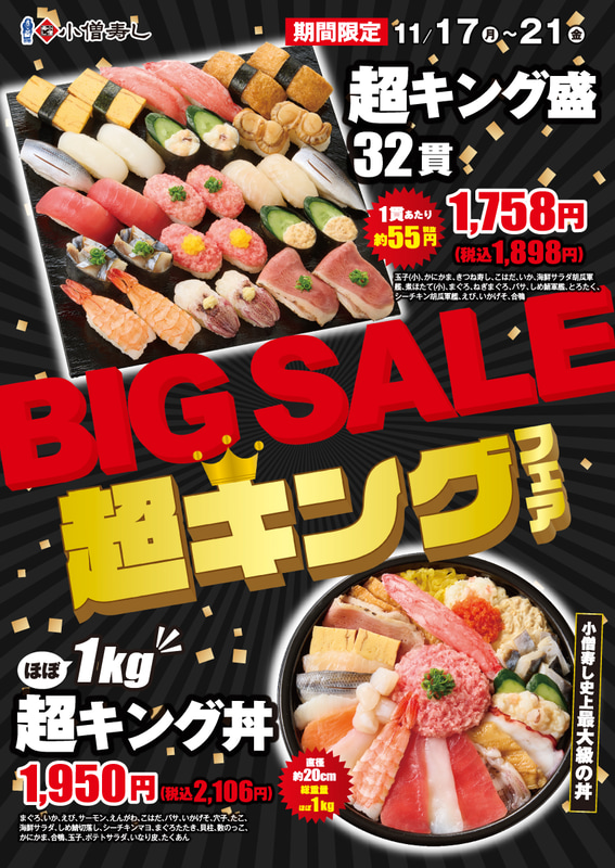 小僧寿し史上最大の直径約20cm・総重量ほぼ1kgの「超キング丼」、「超キング盛 32貫」は1貫当たり税込60円! 小僧寿しが「BIG SALE!『超キング』フェア」を本日17日(月)から開催
