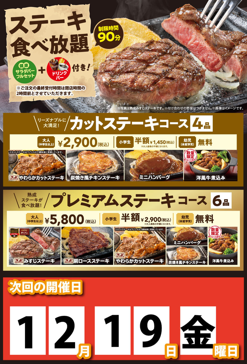 ステーキガストが今年最後の「ステーキ食べ放題」を明日19日(金)開催! ステーキなど肉料理4品、ライス・カレー・サラダなど食べ放題にドリンクバー付きで税込2,900円