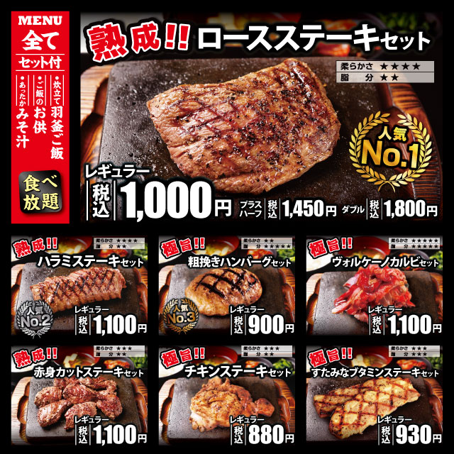 ロースステーキに羽釜ご飯・みそ汁・ご飯のお供食べ放題のセットで税込1,000円! コスパ最強ステーキハウス「感動の肉と米」が53店舗目「武蔵村山店」を本日22日(月)オープン~極旨!!チキンステーキは税込880円