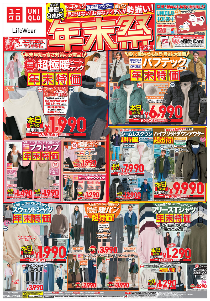 約2.25倍暖かい「超極暖ヒートテックT」税込1,990円、「スウェットシャツ」税込1,990円、「シームレスダウンショートジャケット」税込7,990円! 「ユニクロ年末祭」第2弾チラシが本日26日(金)公開