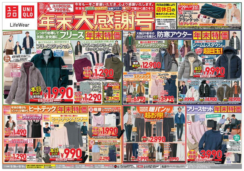 買い忘れはない? ユニクロの年末特価は本日31日(水)まで! 「フリースジャケット」税込1,990円、「パフテックコンパクトベスト」税込3,990円、「シームレスショーツ」が2枚で税込990円など