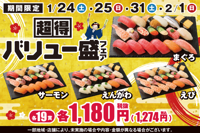 人気ネタたっぷり19貫で税込1,274円! 小僧寿しがお腹もお財布も満足な「超得バリュー盛フェア」を本日24日(土)から開催