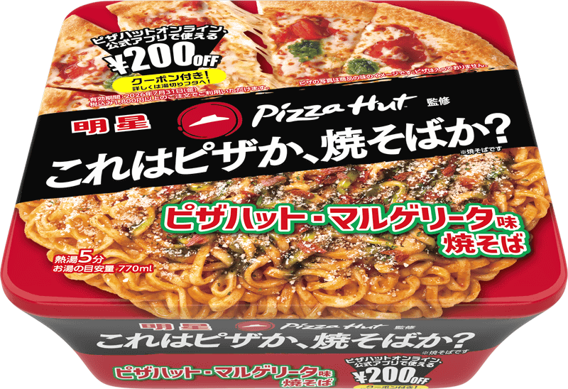これはピザか、焼そばか? 「ピザハット」が徹底監修でもはやピザの味わいのカップ焼そば! 「明星 ピザハット監修 ピザハット・マルゲリータ味焼そば」を本日26日(月)発売~ピザハットのクーポンもついてくる!