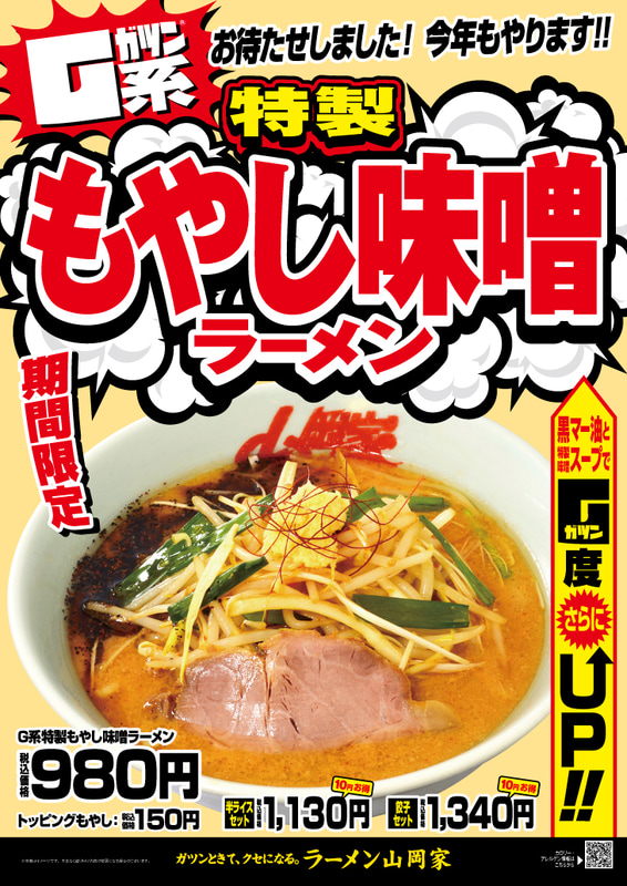 黒マー油と特製味噌スープでガツン度さらにアップ! 1,701kcalの一杯! 山岡家の冬の定番「G系特製もやし味噌ラーメン」が今年も本日29日(木)から販売開始