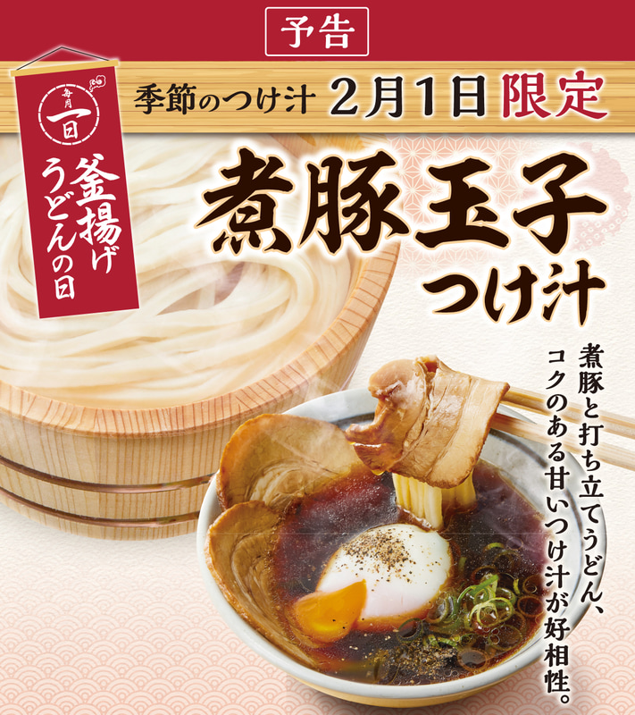 丸亀製麺の「釜揚げうどん」が半額の税込190円! 得サイズは390円お得な税込380円! 今年最初の「釜揚げうどんの日」が明日1日(日)開催~「煮豚玉子つけ汁」も数量限定で販売