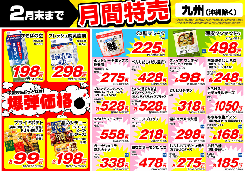 業務スーパーが2月の「月間特売」チラシ公開! 「炭酸水 500ml」税込38円、「プリマハム あらびきウインナー 700g」税込602円、「辛ラーメンカップ・キムチ・激辛」各税込113円、「R-1 112g」税込118円など