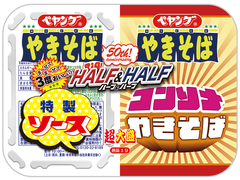 ソース味とコンソメ味を個々でも、混ぜても3度おいしくて1,098kcal! 「ペヤング 超大盛やきそばハーフ&ハーフコンソメ」が本日2日(月)からユアサ・フナショク限定で発売~かやくは皮付きポテト、キャベツ、ごま、紅生姜など