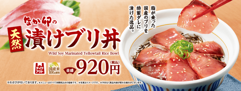 脂が乗った天然国産ブリを特製ダレに漬けた冬限定の一品! なか卯が「天然漬けブリ丼」を本日4日(水)発売~大盛ご飯に2倍の漬けブリを盛り付けた“特盛”も!