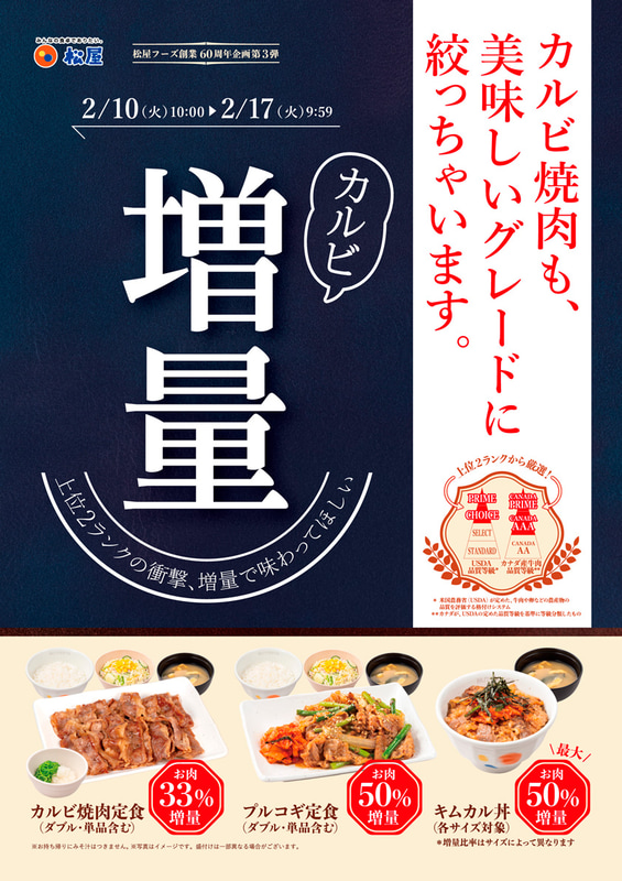 上位2ランクに絞り込んだ旨味あふれる牛カルビ肉を増量で味わってほしい! 松屋60周年企画第3弾「カルビ焼肉増量フェア」が開催