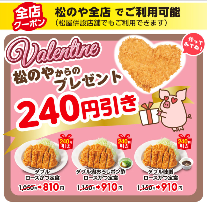 松のやが240円引き「バレンタインクーポン」を公式アプリで配信! 「ダブルロースかつ定食」(1,272kcal)が税込810円
