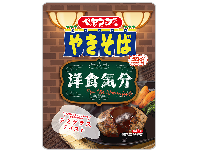 鶏・豚味付ひき肉、皮付きポテト、にんじん、コーンも入ってまるでハンバーグプレートのような満足感あるペヤング! 「ペヤング 洋食気分 デミグラステイストやきそば」も発売