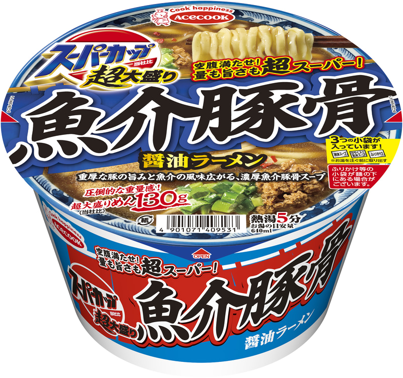 めん130gでスーパーカップ史上最高の食べごたえ! こだわり濃厚スープと具材がしっかり絡む「超大盛り 横浜家系豚骨醤油ラーメン/濃厚豚醤油ラーメン」リニューアル、「魚介豚骨醤油ラーメン」新発売