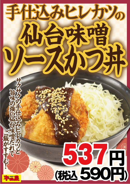 サクサク手仕込みヒレカツをご飯にのせて、旨味の強い仙台味噌だれをかけて税込590円! 大衆食堂「半田屋」が「手仕込みヒレカツの仙台味噌ソースかつ丼」を本日4日(水)から1週間限定販売