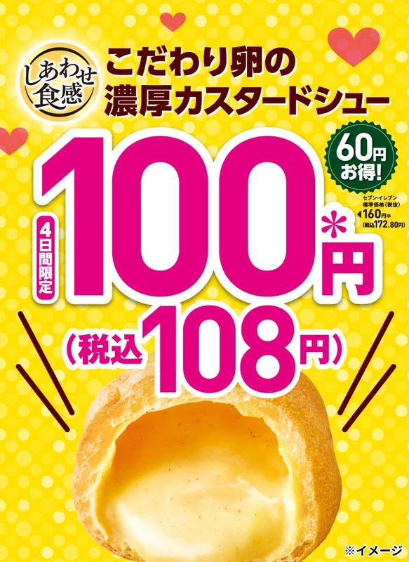 鞘ごとすり潰したバニラ使用カスタードクリームを増量したシュークリームが64円引きの税込108円! セブン‐イレブンが「【北海道限定】こだわり卵の濃厚カスタードシューを100円(税込108円)」を本日5日(木)から開催