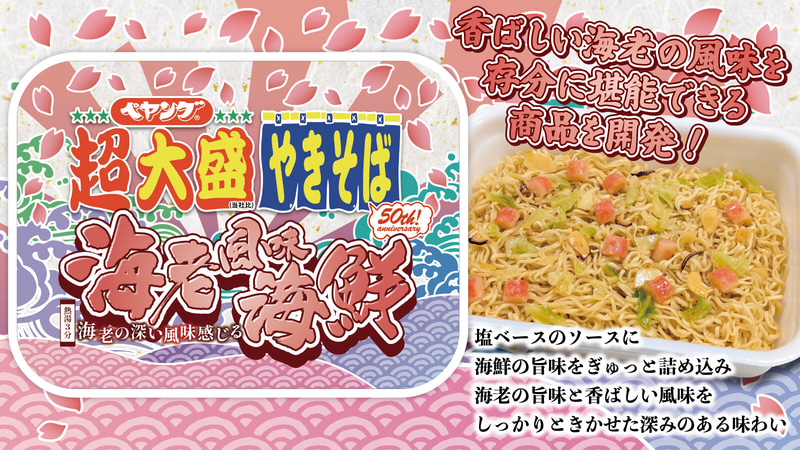 香ばしい海老の風味で春を楽しめる海鮮の旨味をぎゅっと詰め込んだソースにカニ風味かまぼこ、キャベツ、イカが入って1,000kcal超え! 「ペヤング 超大盛海老風味海鮮やきそば」が本日23日(月)発売